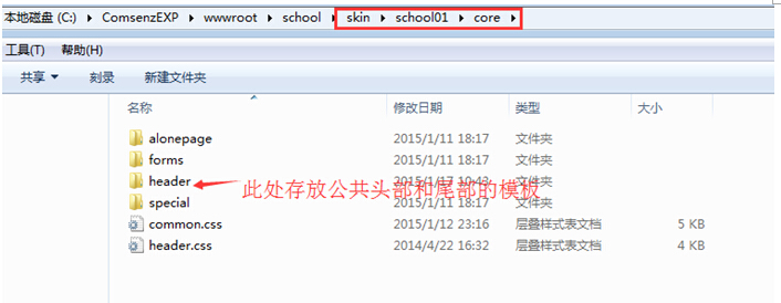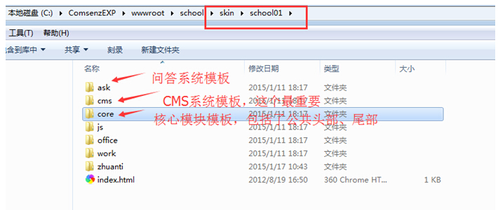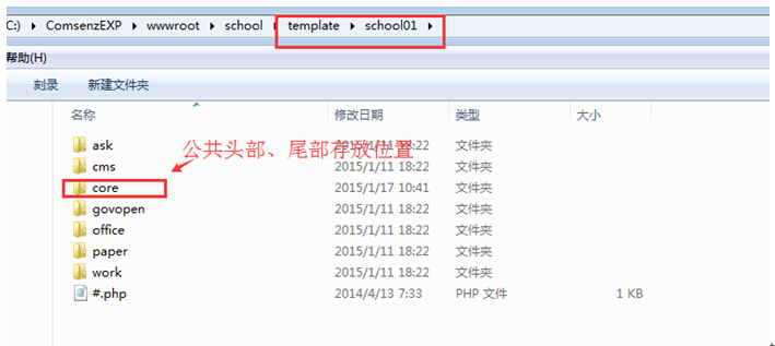 进入template---school01模板里面,core是核心模块模板文件夹,里面有主要存放公共头部和尾部,这个得记住。头尾部就是存放在此的。